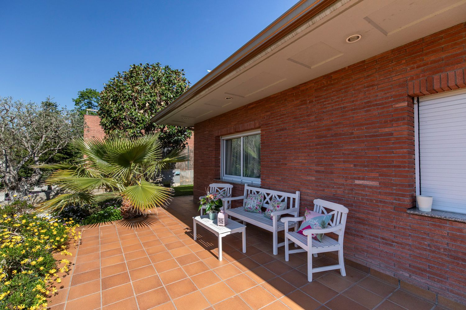 Amplio porche con zona de descanso que rodea la vivienda.