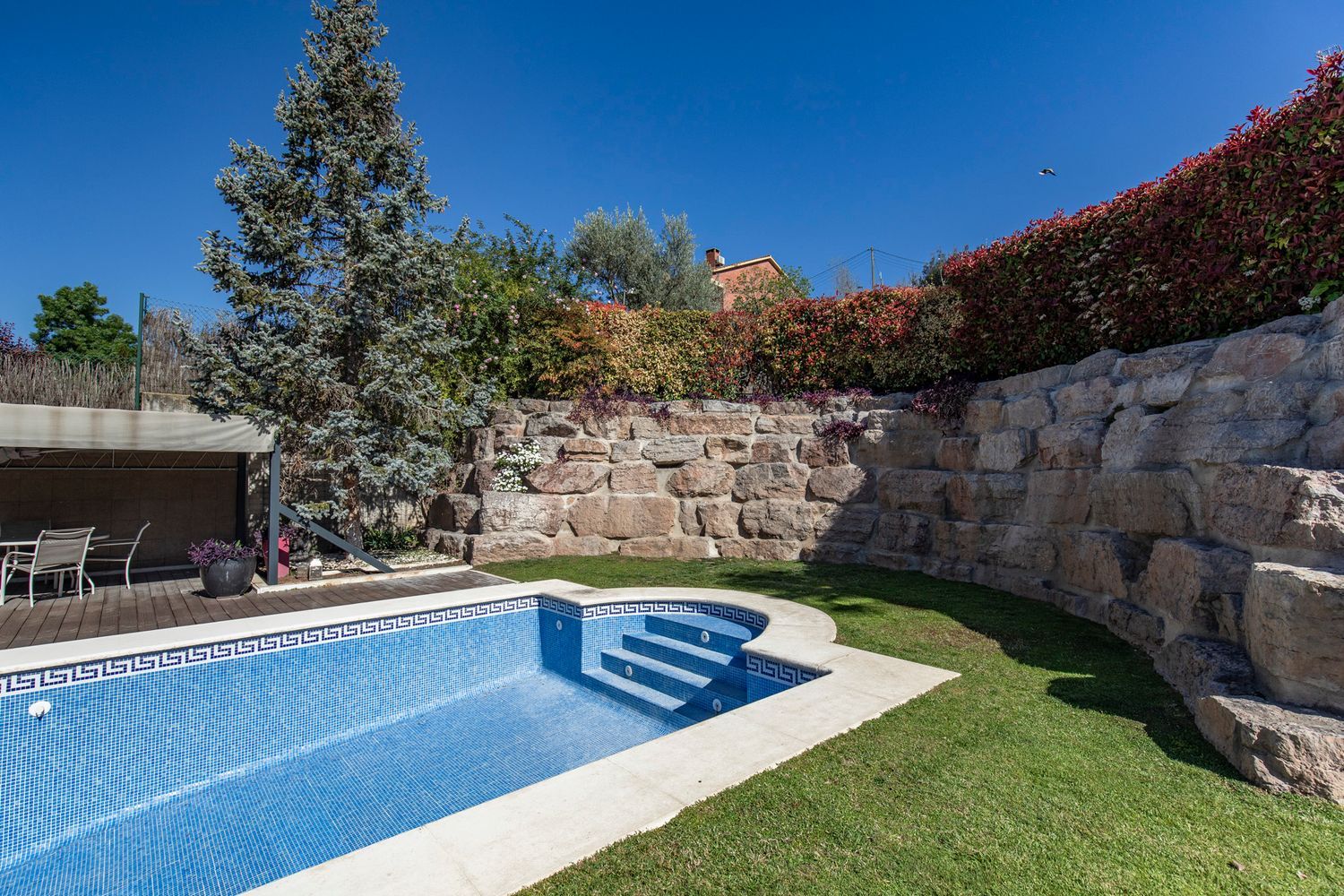La finca está ubicada en un bonito jardín con piscina y zona para barbacoa, donde también tenemos una fantástica pérgola. Una habitación con baño.